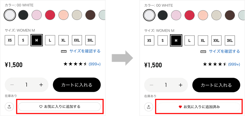 商品ページでサイズとカラーを指定し、[お気に入りに追加する]をタップすると登録できます。