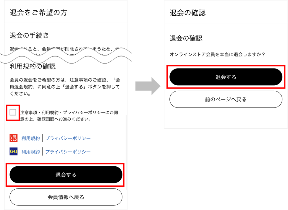 退会手続きページで、注意事項・利用規約・プライバシーポリシーにご同意のうえ、お手続きください。