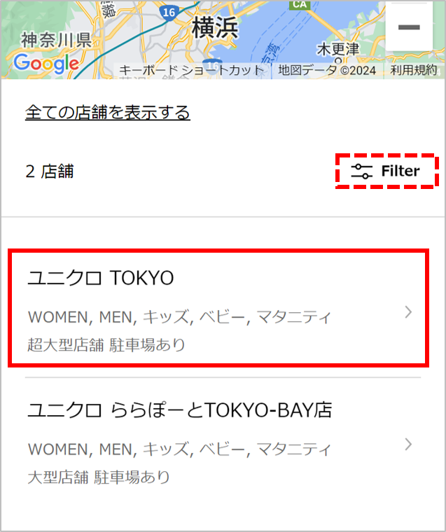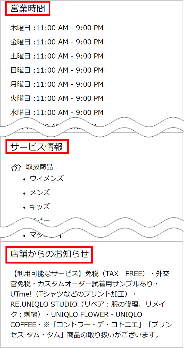 - ベビー・キッズ・マタニティ商品の取扱いや駐車場の有無、ユニクロ店舗受取りサービス実施の可否など