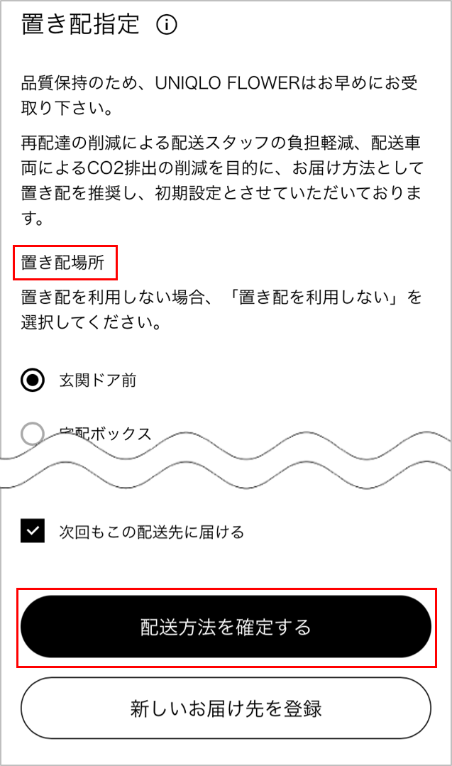 置き配場所を指定し、[配送方法を確定する]を選択してください。