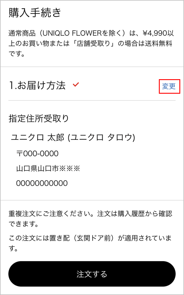 ※内容を変更する場合は、「1.お届け方法」の右側にある[変更]から変更が可能です。