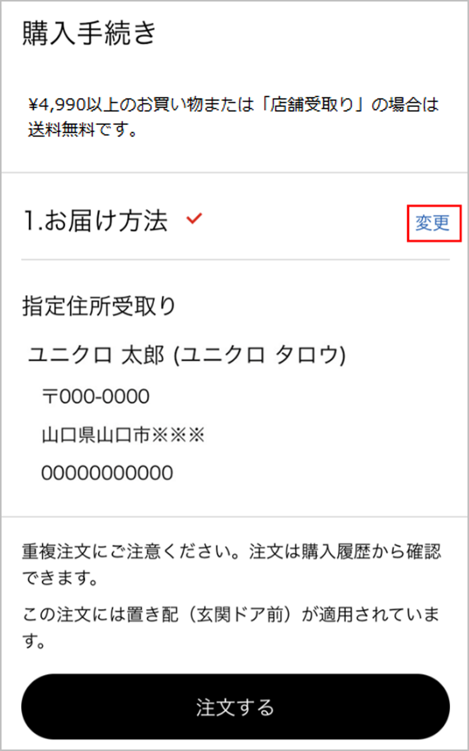 ※内容を変更する場合は、「1.お届け方法」の右側にある[変更]から変更が可能です。