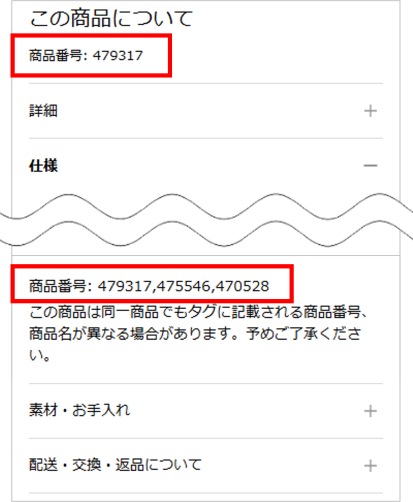 各商品ページ内の[この商品について]および[仕様]に記載されている6桁の数字が商品番号です。