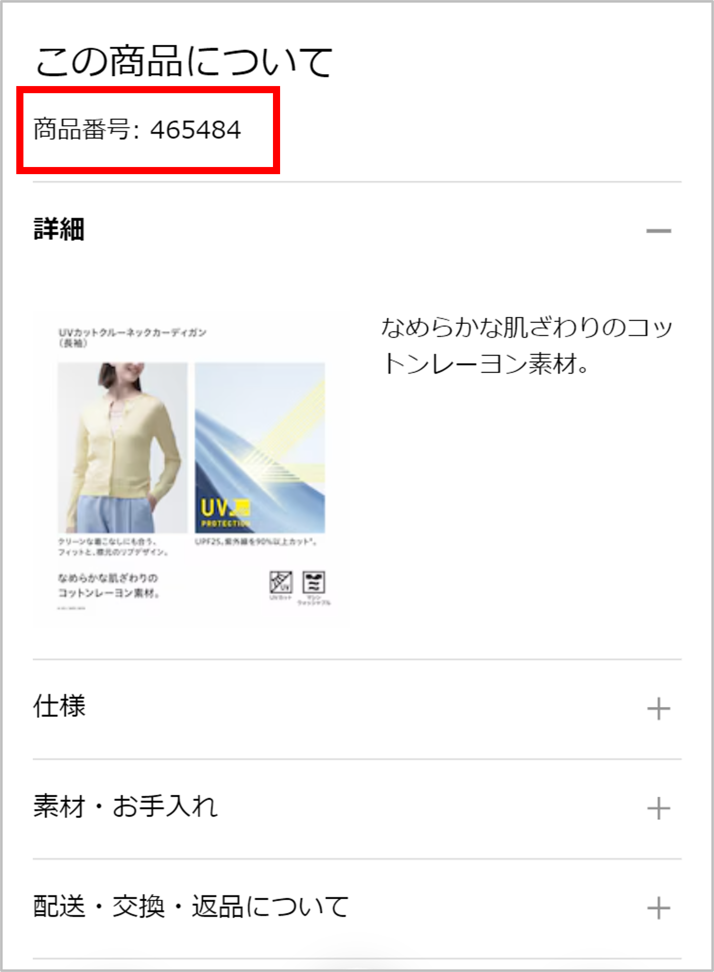 各商品ページ内の[この商品について]に記載している6桁の数字が商品番号です。