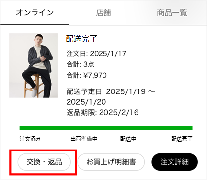 - 該当するご注文の[交換・返品]ボタンをタップ