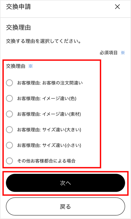 *裾上げやお直しをしている商品は返品がお受けできないため、[カラー・サイズ違いの交換申請へ]ボタンは表示されません。 - 交換理由を選択し、[次へ]をタップ